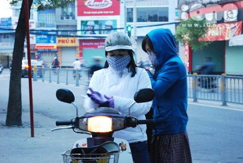 Không ít bạn co ro trong bộ đồng phục váy ngắn. Đầu trùm mũ, tay áo dài được tận dụng kéo làm găng tay.