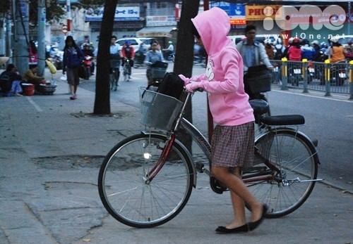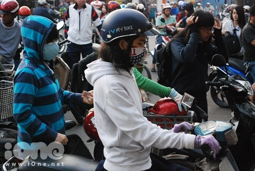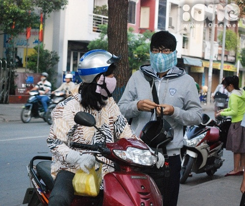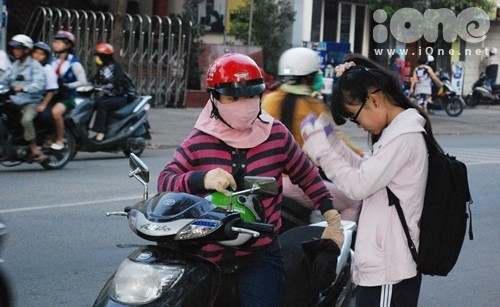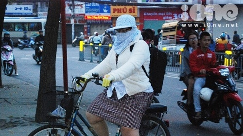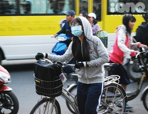 Mới sáng sớm nhưng cô bạn này đã phải dùng khẩu trang trùm kín mặt như thế này khi đạp xe đến lớp.