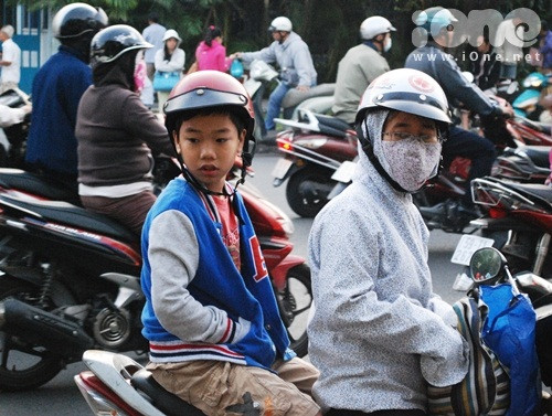 Không chỉ học sinh, hầu hết người đi làm sáng sớm tại TP HCM đều phải khoác thêm áo, quàng khăn... Những bạn nhỏ cũng được mẹ trang bị đồ ấm khi ra đường.