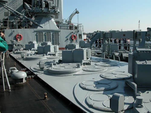 Tên lửa S-300FM được bố trí trong các ống phóng thẳng đứng kiểu ổ quay phía boong sau. Ảnh: Missilethreat
