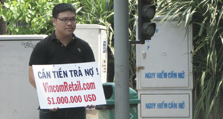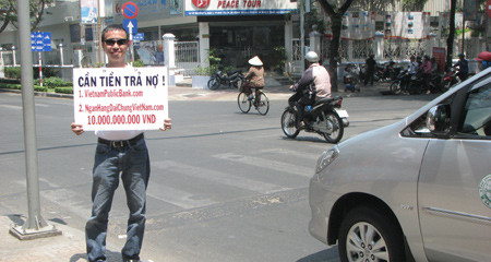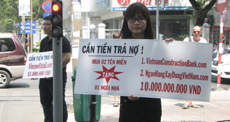 Một nhóm người đang thay nhau cầm những tấm bảng ghi tên miền, giá tiền cụ thể từng tên miền đứng ở ngã tư Trương Định – Võ Văn Tần để bán dạo cho người đi đường. Lý do được ghi rõ ràng trên các tấm bảng là “cần tiền trả nợ”, “cần tiền cưới vợ”…