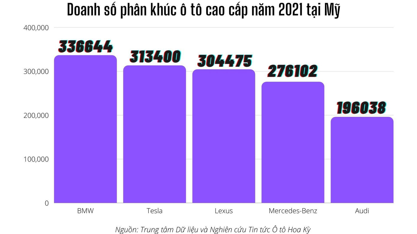 Thương hiệu xe hơi chạy điện thuần túy, Tesla, đứng thứ hai sau BMW về doanh số trong phân khúc xe sang/xe cao cấp vào năm 2021 với doanh số 313.400 xe chỉ tính riêng tại Mỹ trong khi BMW dẫn đầu với doanh số 336.644 xe. Đây là lần thứ ba thương hiệu ô tô đến từ Đức giành chiến thắng trên bảng xếp hạng này.