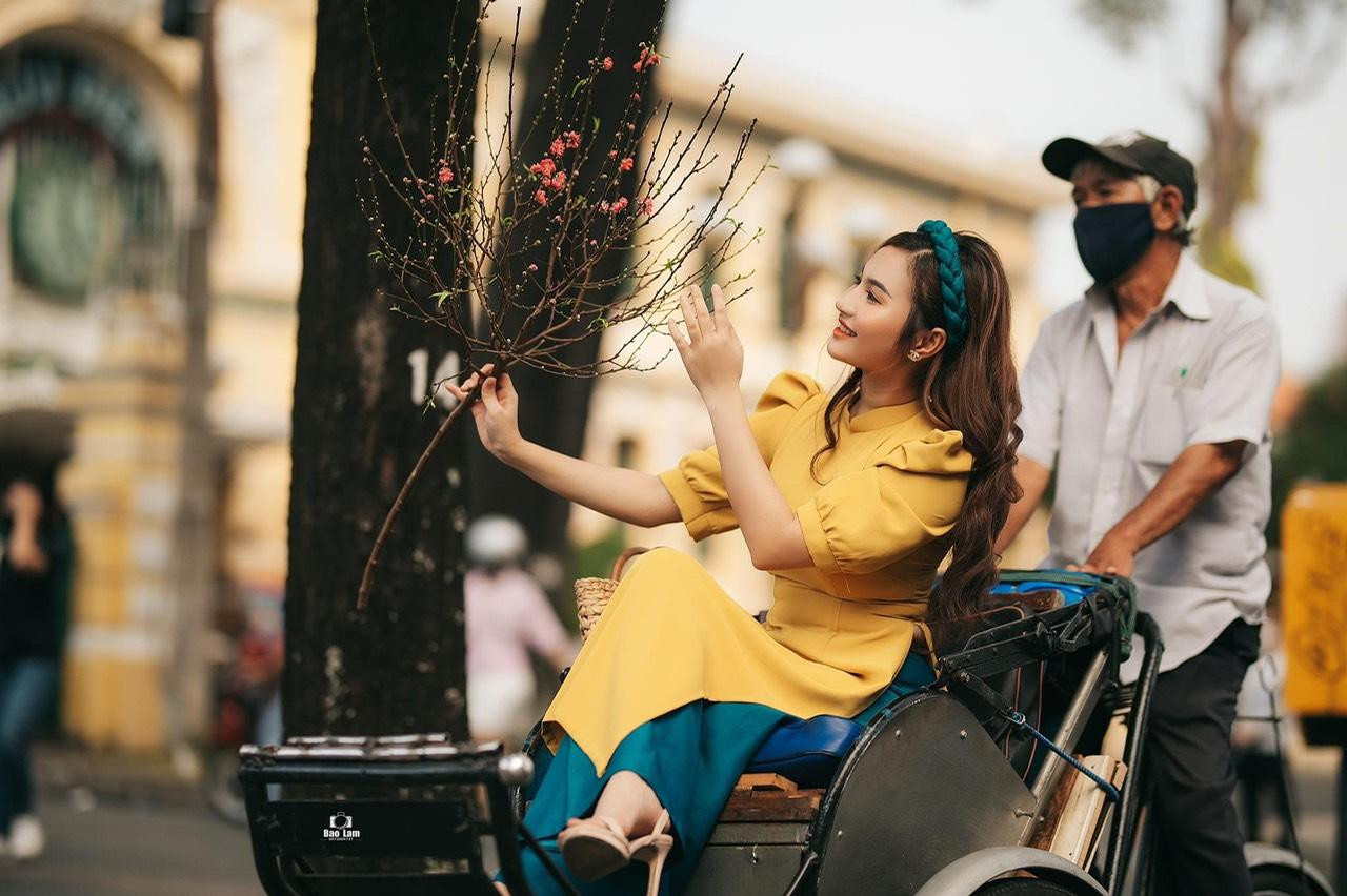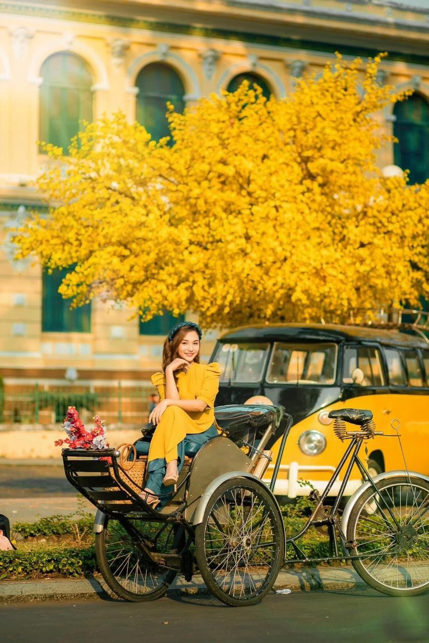 Nổi bật nhất trong những bộ ảnh Tết xuất hiện đầu tiên trên mạng xã hội phải kể tới bộ ảnh của bạn Dương Huỳnh Như (sinh năm 1999) đến từ Bến Tre. Lấy bối cảnh gần Nhà thờ Đức Bà – nơi được những cây mai vàng tô sắc từ rất sớm, Huỳnh Như gây ấn tượng với bộ ảnh chào Xuân rực sắc vàng.