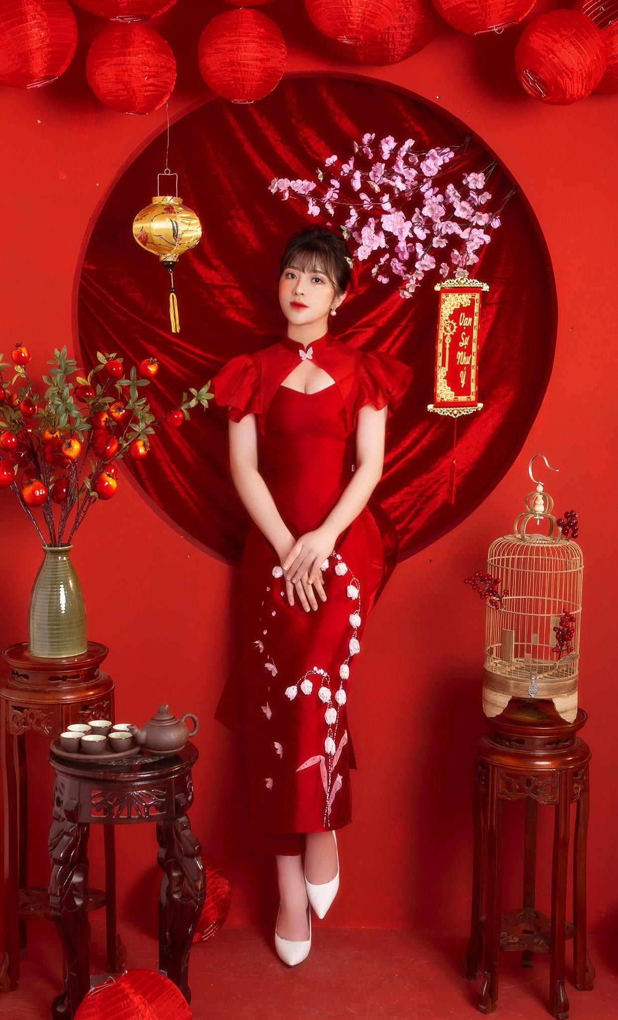 | Ngô Mỹ Quyên (Yên Bái) nổi bật với bộ ảnh Tết tone đỏ. |