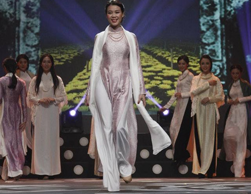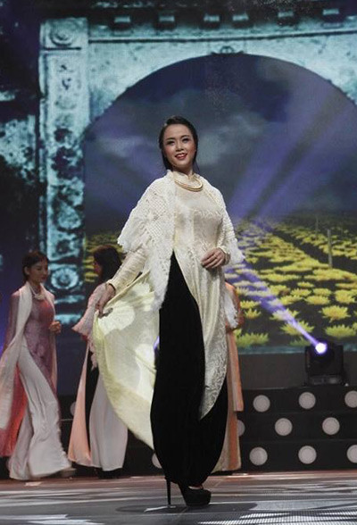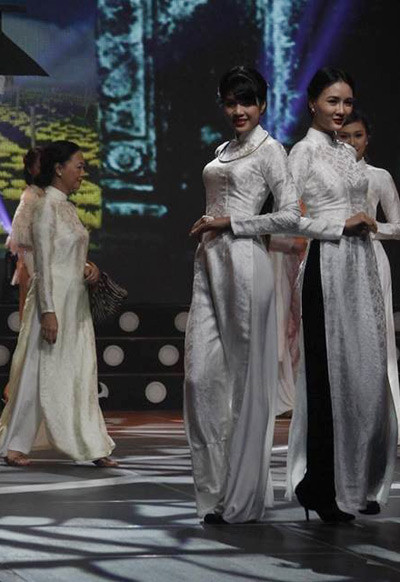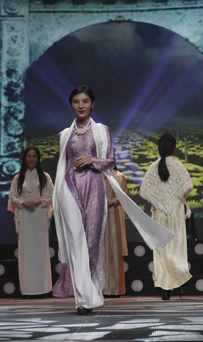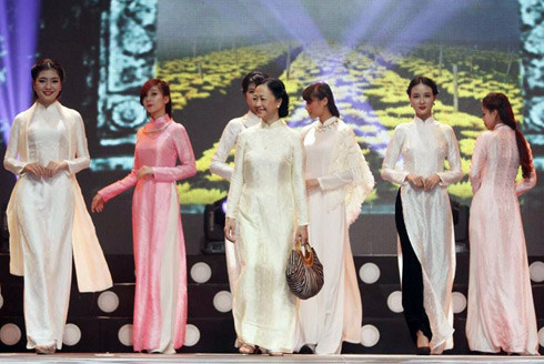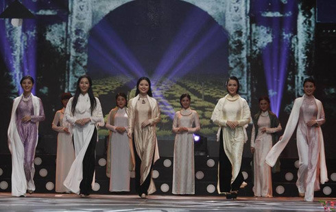 Trên nền chất liệu tơ tằm cổ truyền, các thiết kế áo dài bay bổng nhẹ nhàng với các màu trắng ngà, xanh lơ, hồng nhạt, vàng mơ...