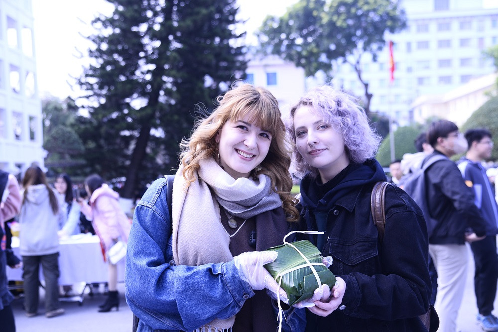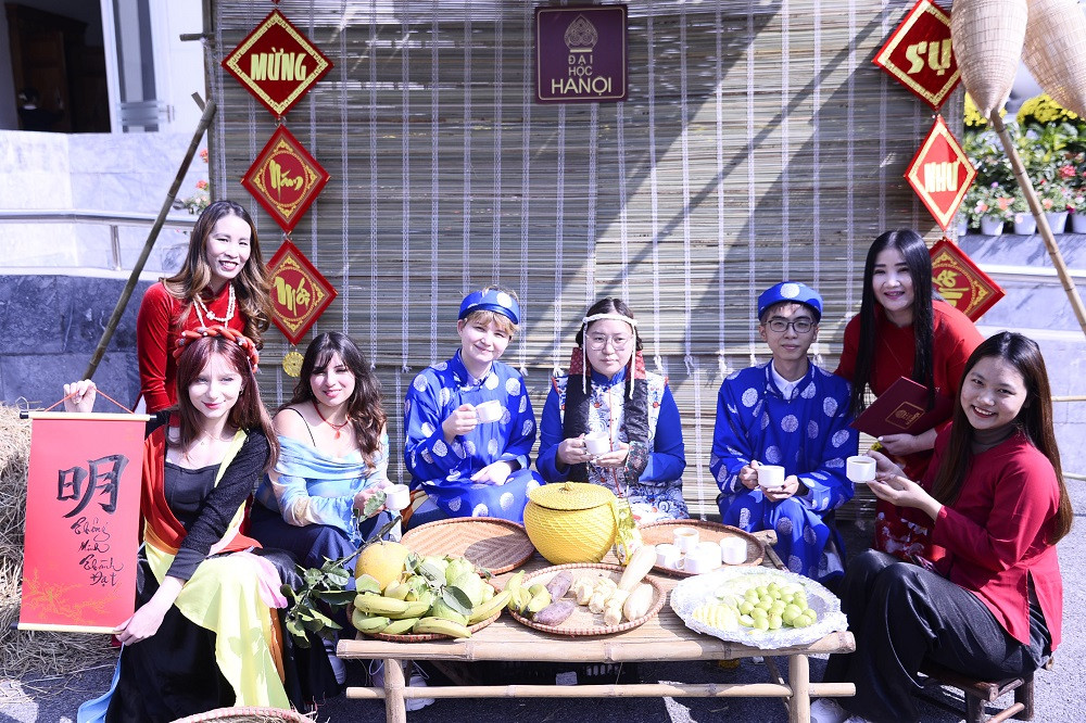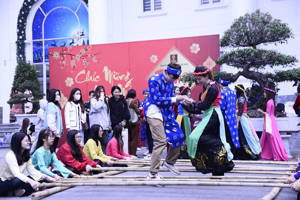 Tết Việt 2023 được Trường Đại học (ĐH) Hà Nội tổ chức với nhiều hoạt động lễ hội phong phú. Chương trình đố vui có thưởng đã mang đến cho sinh viên quốc tế những kiến thức về phong tục đón Tết quen thuộc của người Việt như: Lễ cúng ông Công ông Táo, phong tục chọn và bày mâm ngũ quả, truyền thống gói bánh chưng, các nghi lễ đêm Giao thừa, phong tục chơi hoa Tết và đi lễ chùa đầu năm mới...