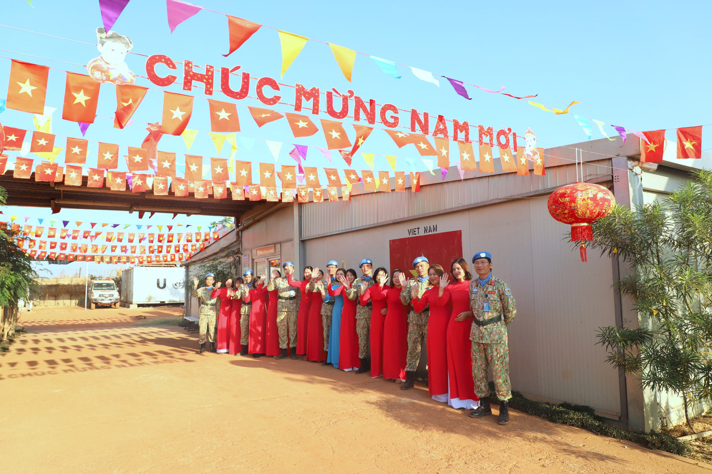 Từ bàn tay khéo léo của các cán bộ, nhân viên và ĐVTN bệnh viện, cảnh quan khu vực đơn vị đóng quân ở Bentiu, Nam Sudan đã được trang trí đèn ở cổng, treo cờ hoa, băng rôn cùng những nhành mai, cành đào tết...