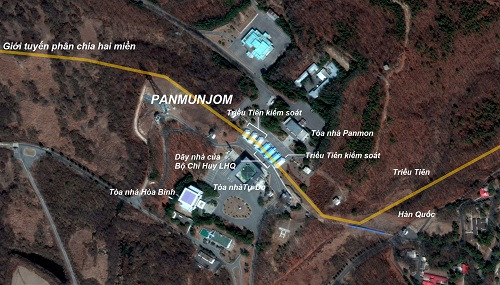 Các tòa nhà được canh gác cẩn mật nằm rải rác trên giới tuyến này từng là địa điểm ký kết thỏa thuận ngừng bắn năm 1953.