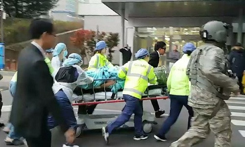 Lực lượng cứu hộ đưa binh sĩ Triều Tiên đào tẩu hôm 13/11 vào bệnh viện. Ảnh: Yonhap.