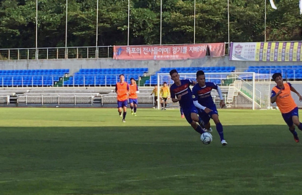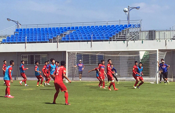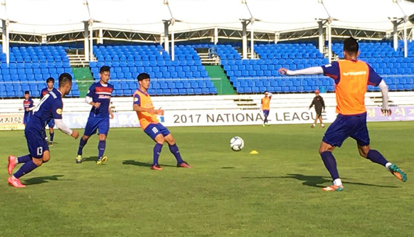 Trong buổi tập thứ 2 tại Trung tâm bóng đá quốc tế Mokpo (Hàn Quốc), HLV Nguyến Hữu Thắng cho các học trò chuyển sang tập chiến thuật.