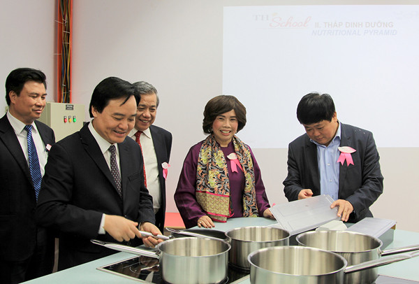 Trong ảnh, các quan khách thăm quan khu vực dạy nấu ăn cho học sinh với giáo viên là đầu bếp của khách sạn 5 sao được mời về từ Dubai
