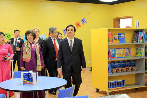 Bộ trưởng Giáo dục và Đào tạo bà Thái Hương và các quan khách thăm thư viện của nhà trường