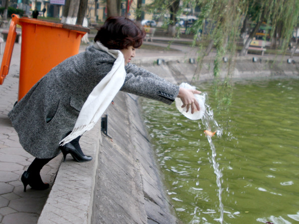 Nhiều bạn trẻ mang cá chép đi phóng sinh.