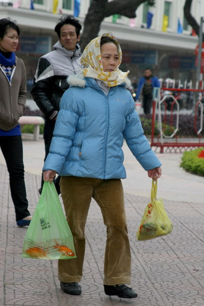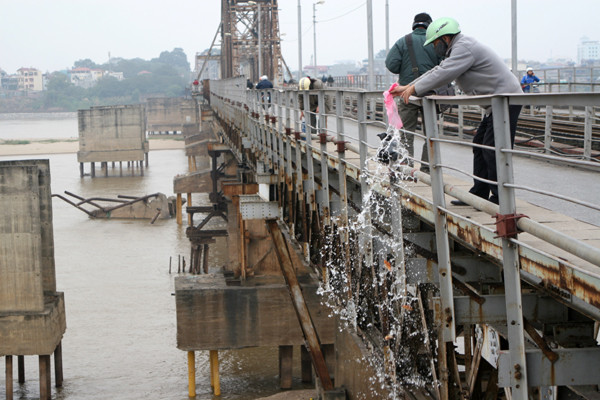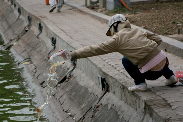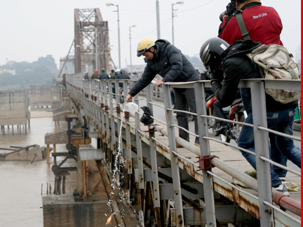Khiêng cả xô cá đi phóng sinh tại khu vực cầu Long Biên, Hà Nội.
