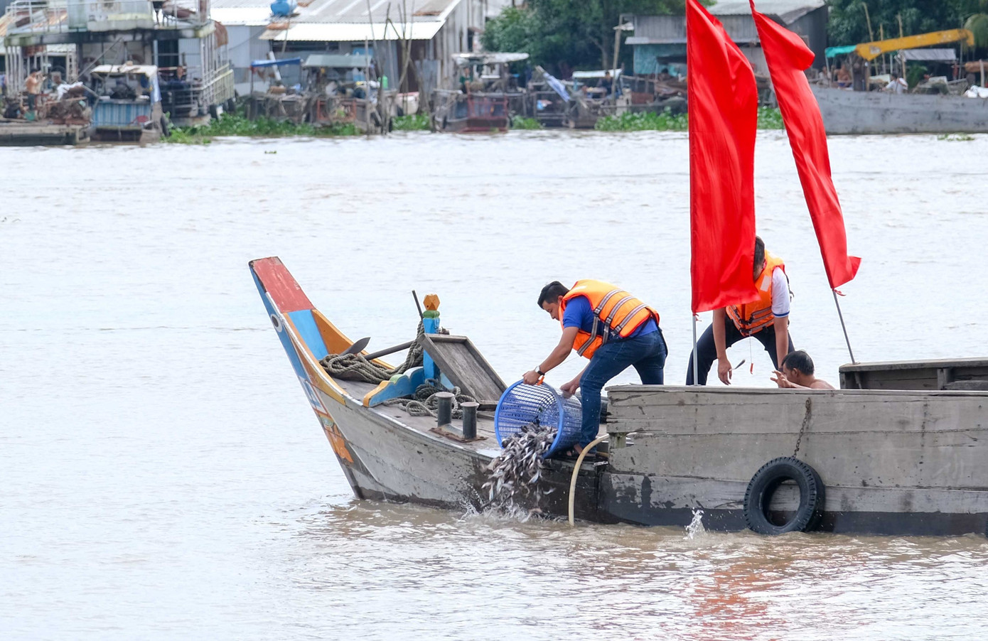 | Hoạt động thả cá diễn ra trên sông Hậu đoạn qua quận Thốt Nốt, thành phố Cần Thơ. |