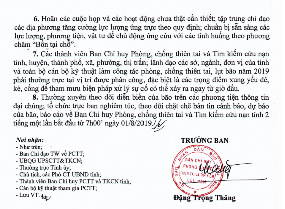 Công điện này cũng yêu cầu ngay trong ngày 31/7, các uỷ viên Ban thường vụ Tỉnh uỷ Thái Bình phải có mặt tại các địa phương, vị trí được phân công để trực tiếp chỉ đạo chống bão.
