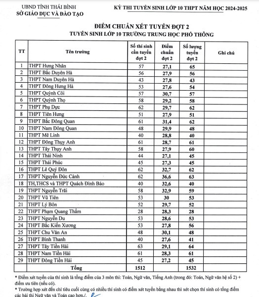 Theo đó, toàn tỉnh có 1.532 thí sinh trúng tuyển vào 29 trường THPT trên địa bàn đợt 2, sau khi có kết quả thanh kiểm tra công tác tổ chức tuyển sinh. Trong đó, Trường THPT Nguyễn Đức Cảnh có điểm chuẩn xét tuyển đợt 2 cao nhất (36,6 điểm), còn Trường THPT Hưng Nhân và Trường THPT Thái Ninh có điểm xét tuyển thấp nhất (cùng 27,1 điểm).