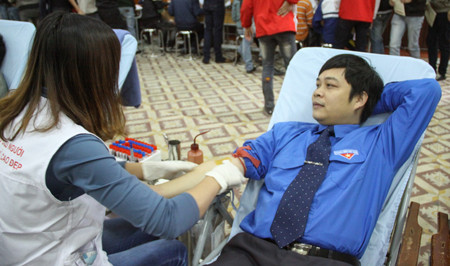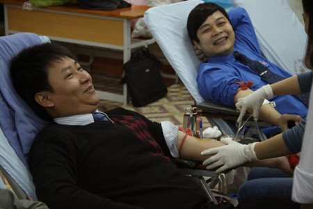 Tham gia hiến máu trong Chủ Nhật Đỏ còn có anh Hà Xuân Linh, Bí thư Đoàn Đại học Thái Nguyên và anh Hồ Bá Dũng, Bí thư Đoàn trường Đại học Kỹ thuật Công nghiệp (trái).