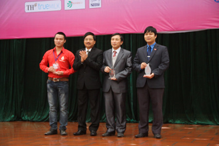 Ông Vũ Tiến, Phó Tổng Biên tập Báo Tiền Phong trao kỷ niệm chương của Chương trình Chủ Nhật đỏ tới đại diện của Đại học Thái Nguyên, trường Đại học Kỹ thuật Công nghiệp và sinh viên Đỗ Quang Hiếu, người có 04 lần hiến máu tính nguyện.