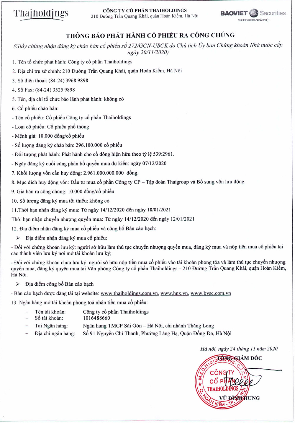 Ngày 20/11/2020 Công ty Cổ phần Thaiholdings được Ủy ban Chứng khoán Nhà nước chấp thuận cho việc chào bán cổ phiếu ra công chúng. Sau đây là Thông báo chính thức về việc phát hành cổ phiếu ra công chúng của Công ty Cổ phần Thaiholdings.