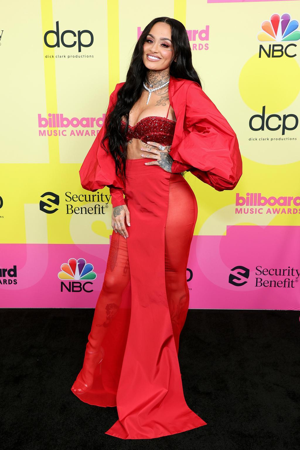 Kehlani mặc thiết kế của Tony Ward màu đỏ rực, khoe vòng 1 trong chiếc áo bra lấp lánh.