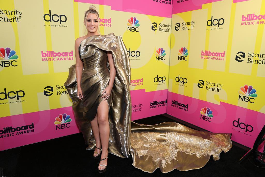 Gabby Barrett, chủ nhân bản hit I Hope có vẻ cũng khá vất vả trong một thiết kế màu gold lấp lánh cồng kềnh.