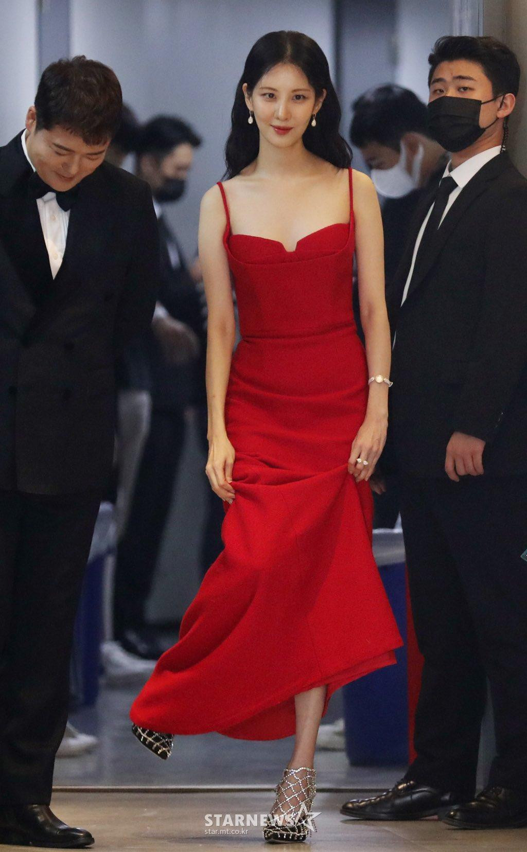 | Xuất hiện tại TMA 2022 với tư cách MC, Seohyun (SNSD) bước lên thảm đỏ đã thu hút sự chú ý của truyền thông lẫn công chúng trong chiếc đầm đỏ nổi bật giữa loạt trang phục đen của các thần tượng. Chiếc váy giúp khoe trọn xương quai xanh và bờ vai quyến rũ của nữ thần tượng. |