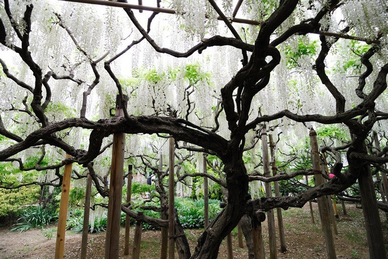 Ba dàn hoa Wisteria trãi rộng trên diện tích 1000 mét vuông, cùng một dàn hoa cực lớn dành riêng cho hoa Wisteria cánh đôi cực hiếm. Tại đây còn có một cây Fuji trên 100 năm tuổi với các nhánh vươn dài phủ kín cây trông giống như chiếc dù khổng lồ màu xanh tím.