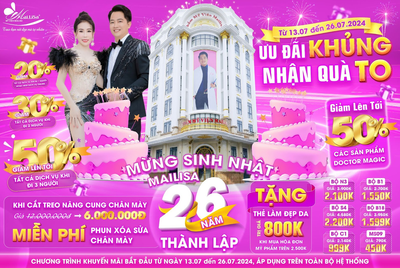 Nhân dịp kỷ niệm 26 năm thành lập, Mailisa giảm lên tới 50% sản phẩm và dịch vụ, chương trình bắt đầu từ ngày 13/07 đến hết 26/07/2024, được áp dụng trên toàn bộ hệ thống