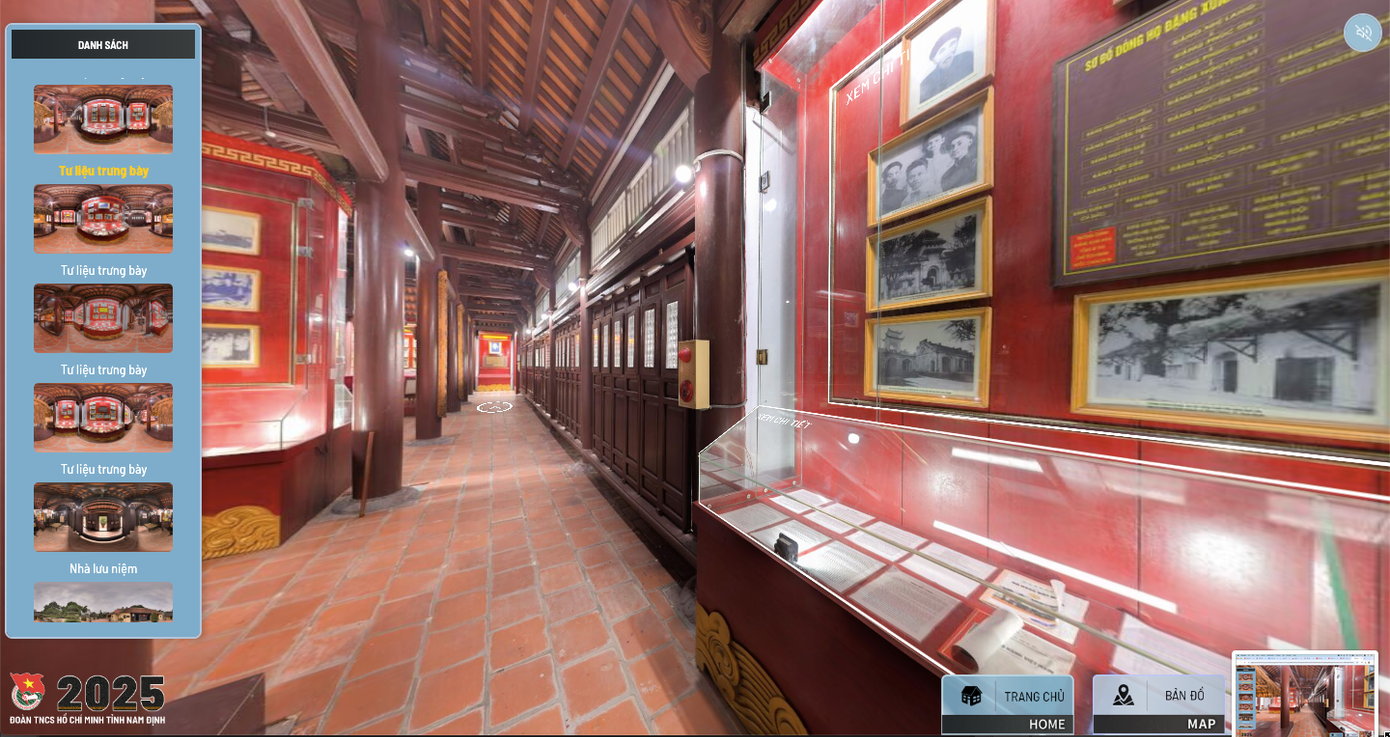Tiếp đó, theo những cú click chuột, người xem sẽ được thưởng lãm hình ảnh từ toàn cảnh đến chi tiết ở khu di tích, như lối vào nhà, hòn non bộ, nhà lưu niệm, ban thờ, tư liệu trưng bày.