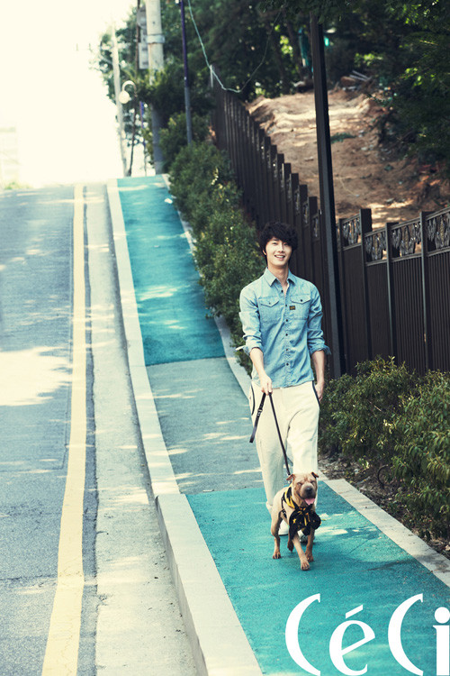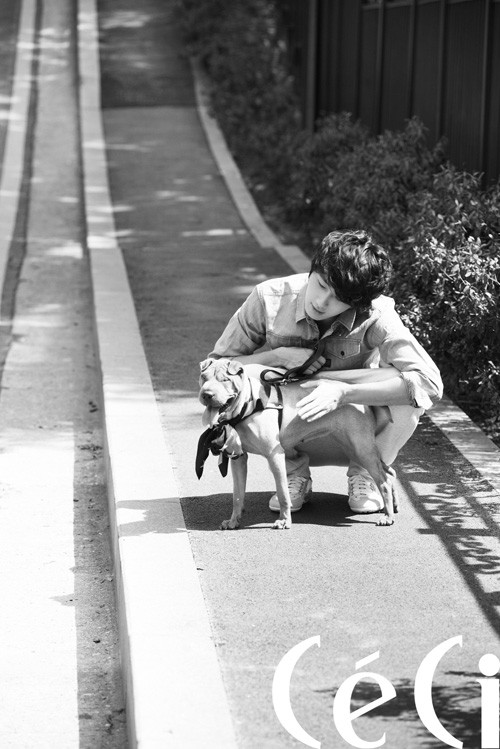 Trong suốt quá trình chụp ảnh, Jung Woo không rời chú cún cưng một giây. Nụ cười rạng ngời của Jung Woo khi đi dạo cùng Ahwoo được chụp rất tự nhiên.