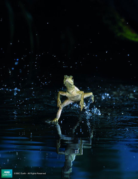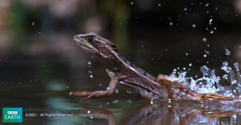 Thân hình của những con thằn lằn này rất nhẹ. Giữa các ngón chân có một màng mỏng khi chạy trên nước chúng xòe ra. Chúng chạy bằng hai chân sau và lấy đuôi làm thăng bằng, cho tới khi hết sức chúng tự cho chìm xuống nhưng cũng không thể chết đuối vì chúng bơi rất giỏi.