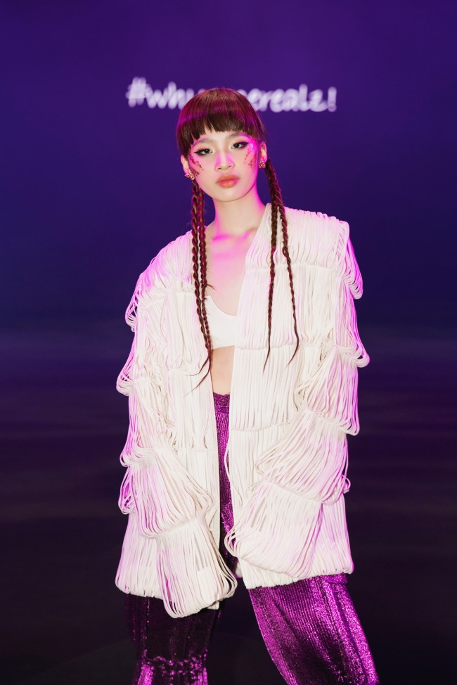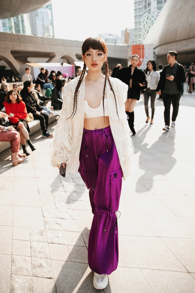 Với bộ trang phục thứ hai, Bảo Hà sành điệu với bộ suit kết hợp giữa áo dây đan trắng cùng quần ánh kim sắc tím. Điểm thu hút của set đồ đến từ kiểu tóc thắt bím và trang điểm độc đáo.