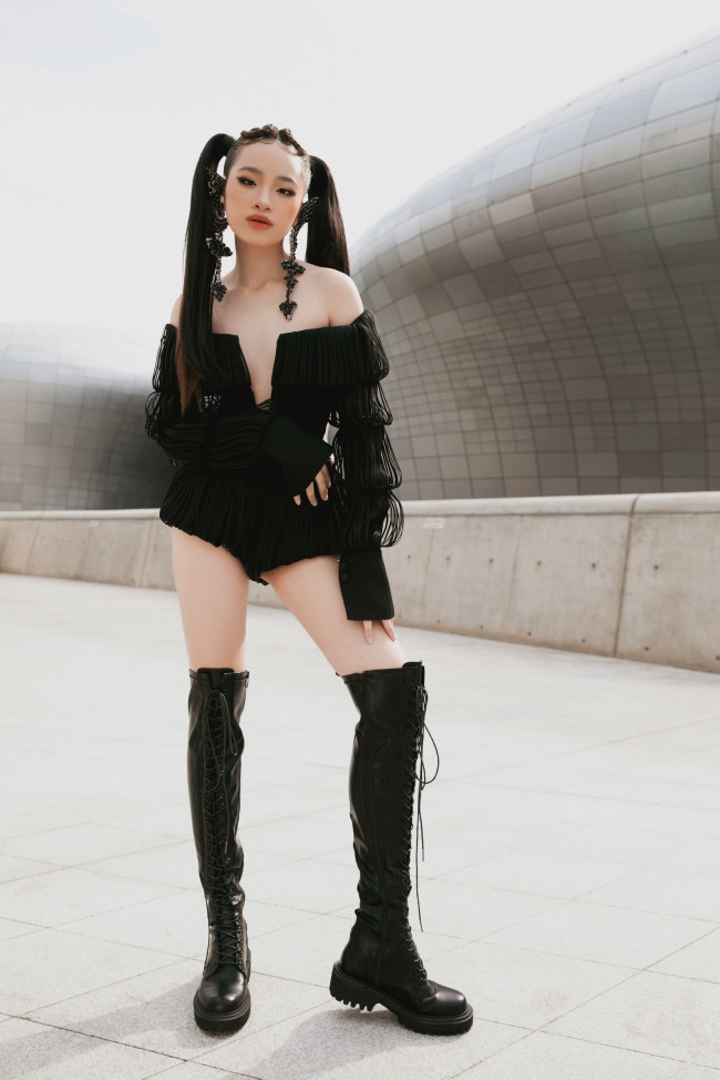 Ở bộ trang phục thứ nhất, Bảo Hà diện thiết kế jumpsuit màu đen cá tính. Bảo Hà mix & match trang phục với phần phụ kiện hoa tai dài ấn tượng, đôi bốt da cá tính và kiểu tóc buộc hai bên. Thời thượng và sành điệu là ấn tượng mà Bảo Hà đưa tới cho mọi người khi diện set đồ này.