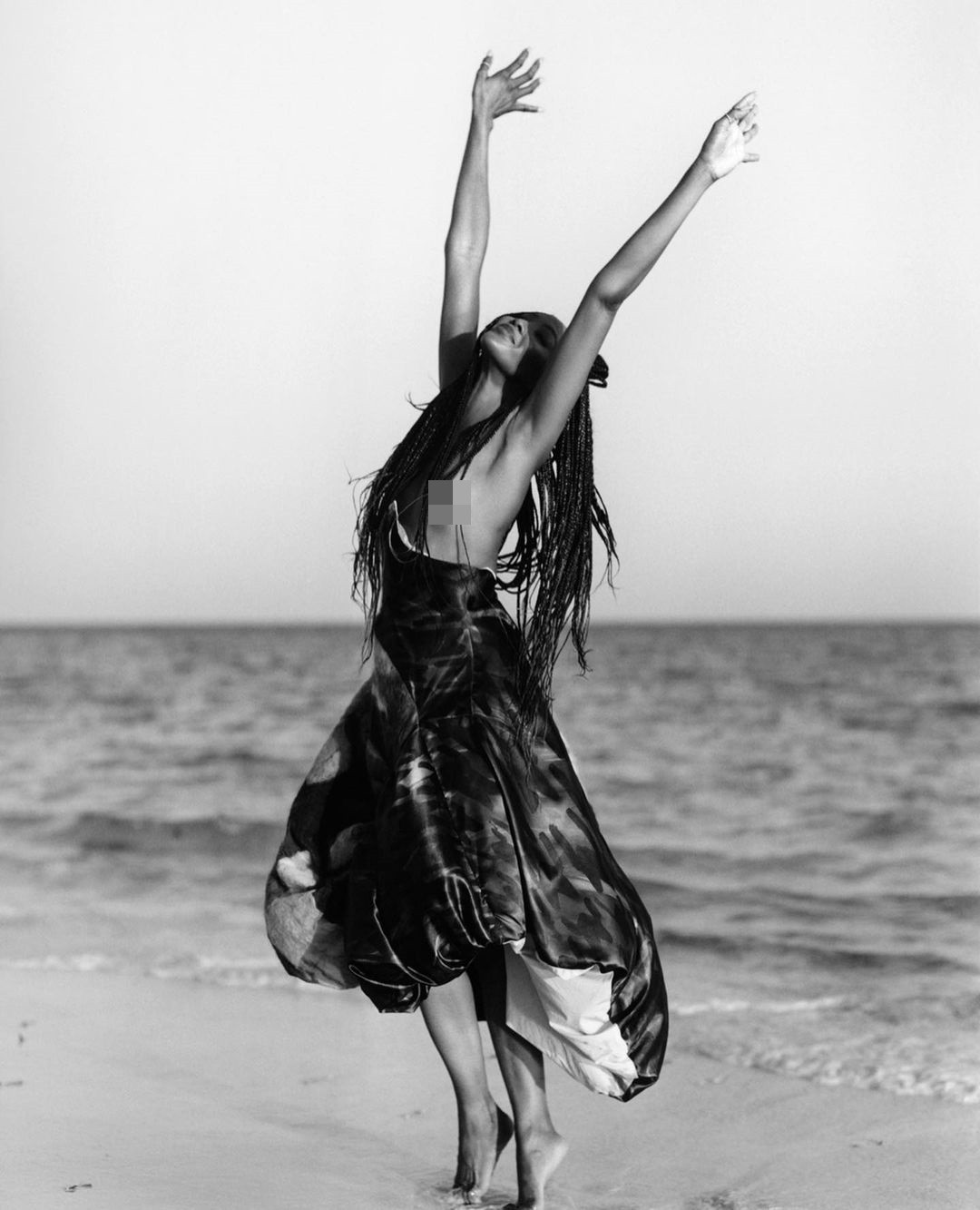 Đội mũ lông ấn tượng, Naomi Campbell táo bạo che ngực trần trên biển.