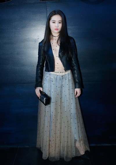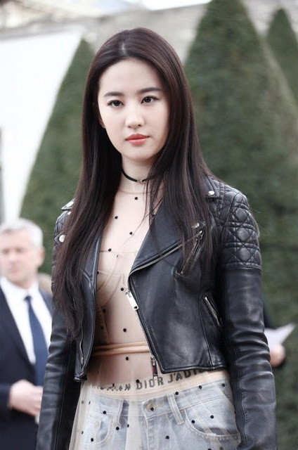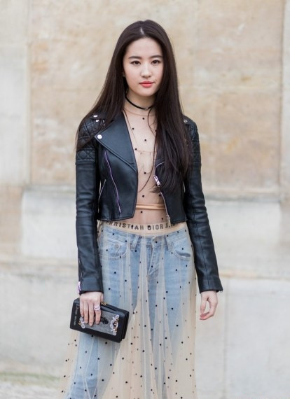 Cô nàng diện áo chẽn bên trong lớp vải mỏng manh xuyên thấu, kết hợp cùng áo da biker sành điệu.