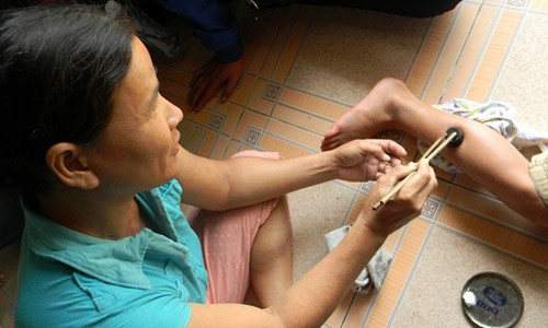 Sau đó bà Tức mang cục sừng nhỏ màu đen cao 2cm, rộng 1,5cm rồi để trên chân phải của cháu Lê Văn Vỹ (11 tuổi, học sinh lớp 5 của Trường Tiểu học Trần Quốc Toản, xã Tiên Ngọc, huyện Tiên Phước) được mẹ là chị Dương Thị Hoa (36 tuổi) chở đến nhà bà nhờ chữa trị vì em bị chó dại cắn.