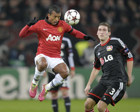 Phút 59, Nani (17-MU) tung cú sút xa từ ngoài vòng cấm địa, đưa bóng đi chệch cột dọc khung thành Leverkusen.