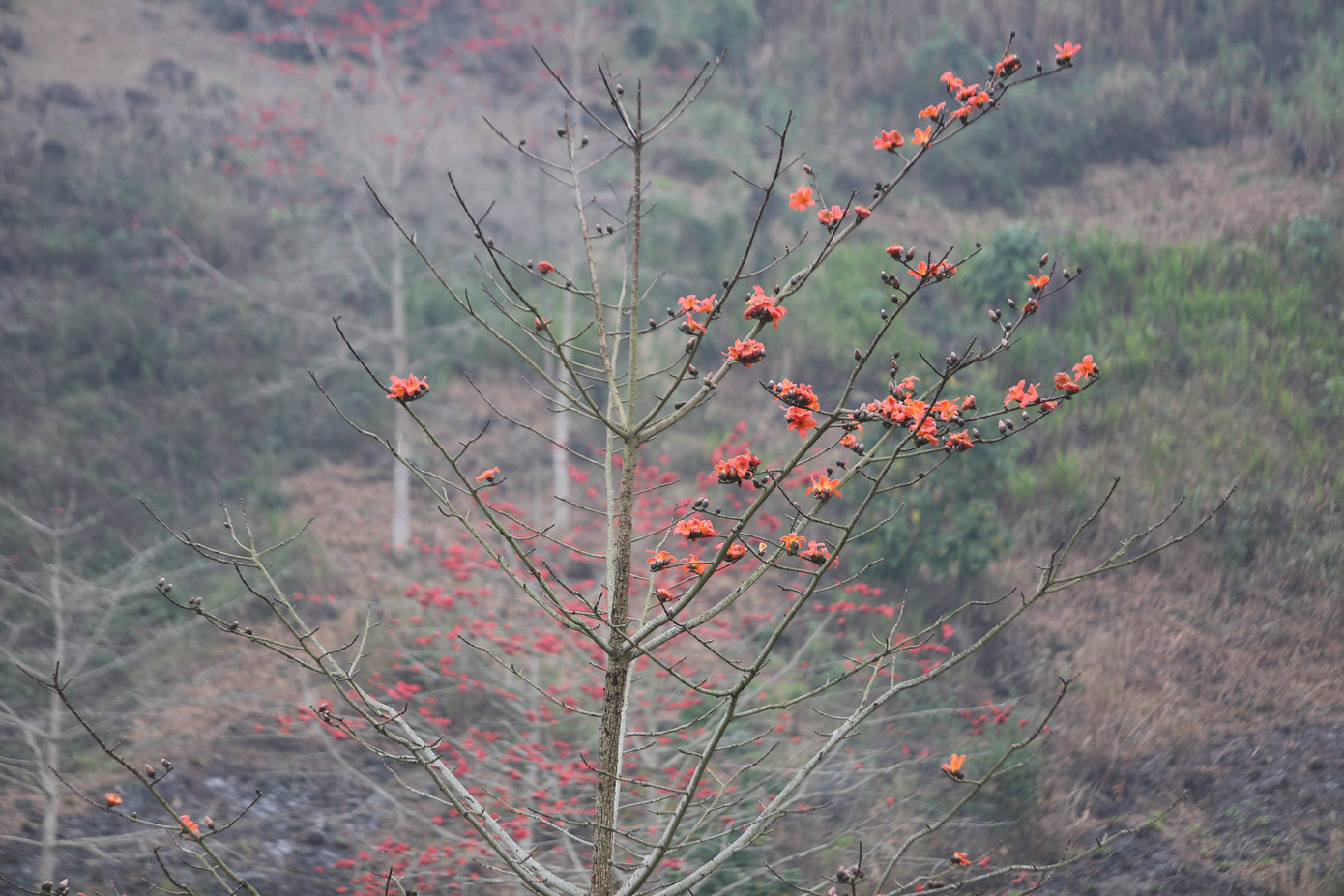 Suốt dọc quốc lộ 4C dẫn tới cao nguyên đá Đồng Văn và huyện Mèo Vạc (Hà Giang), những đốm hoa gạo đỏ rực rỡ thấp thoáng như mời gọi nhưng ấn tượng hơn cả là trên cung đường từ xã Cản Tỉ đến xã Đông Hà (huyện Quản Bạ).
