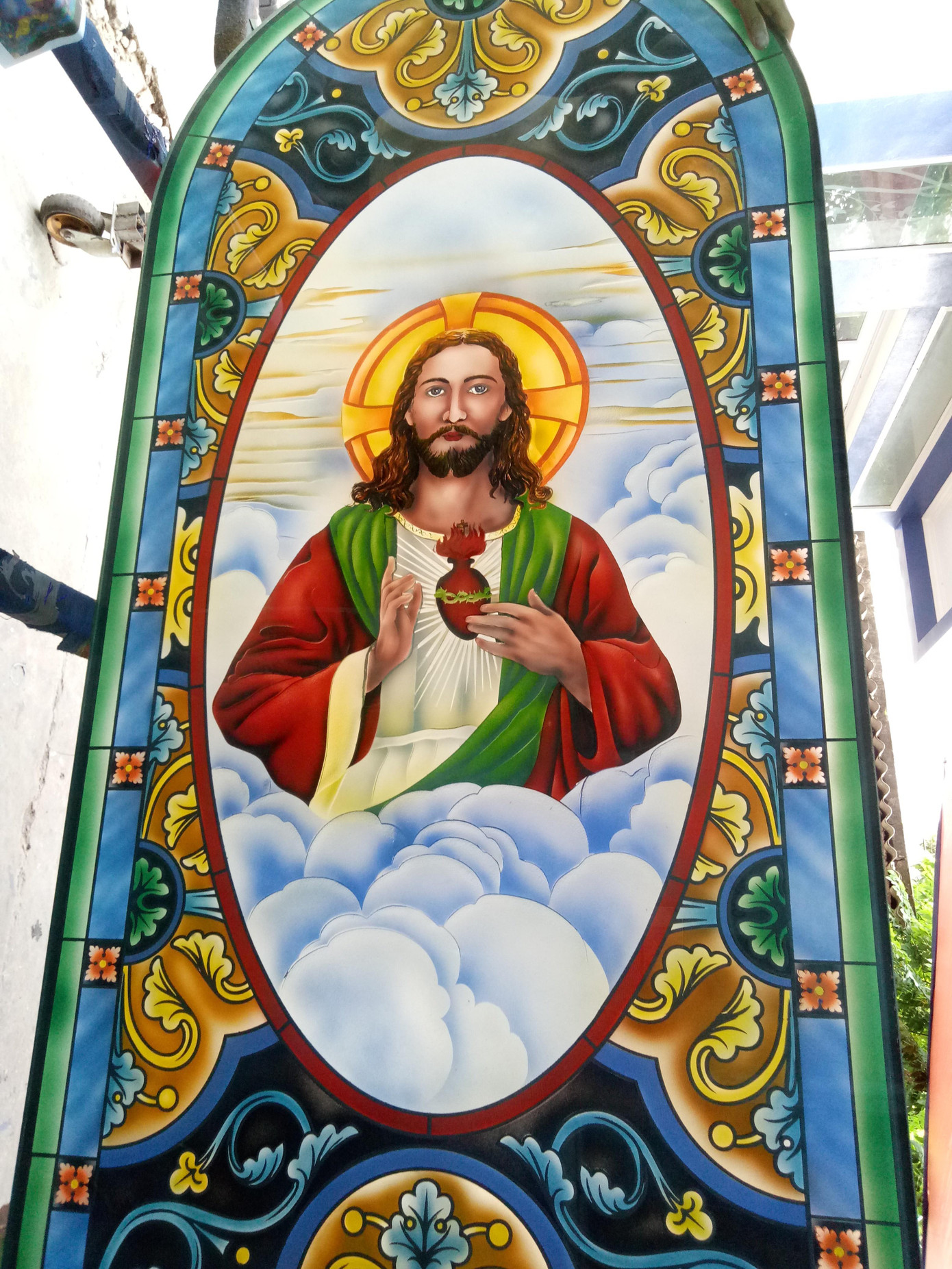 | Bức tranh kính bị vỡ của nhà thờ Công giáo được ông tái tạo |