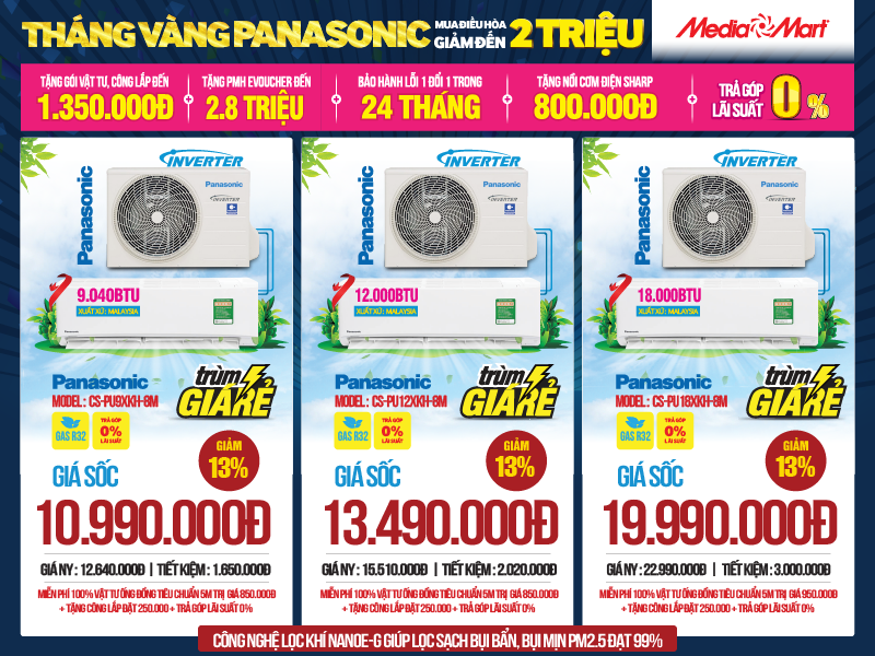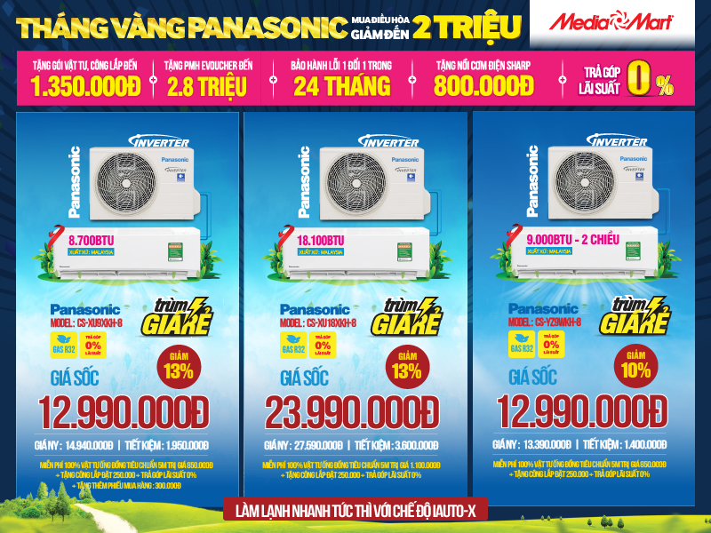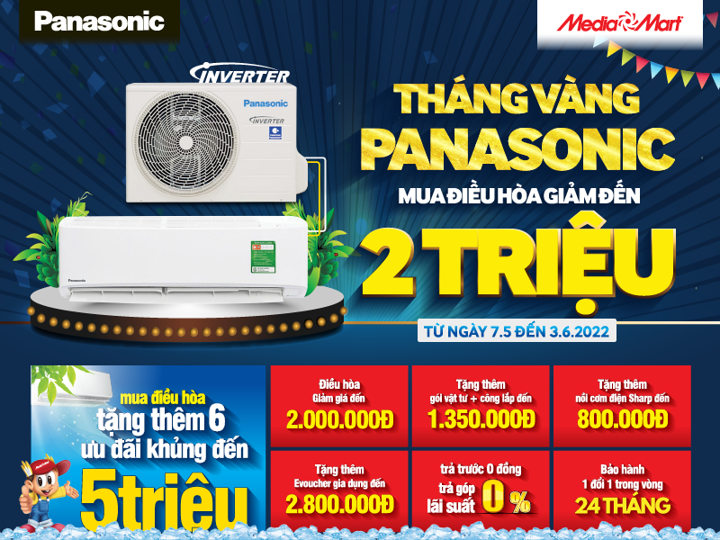 Theo đó, từ ngày 7/5 đến hết ngày 3/6, khi mua sắm các sản phẩm điều hòa Panasonic tại các siêu thị điện máy MediaMart trên toàn quốc, khách hàng được Giảm giá đến 2 triệu đồng, tặng gói vật tư ống đồng và công lắp đặt đến 1.35 triệu đồng, tặng thêm nồi cơm điện Sharp đến 800,000đ, tặng phiếu mua hàng Evoucher trị giá 2,8 triệu đồng, trả góp 0% - trả trước 0 đồng.