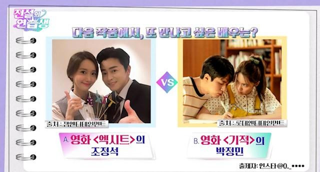 Cuối cùng, Yoona đã lựa chọn Park Jung Min mới là diễn viên vẫn luôn “gây thương nhớ” với mình. Và giải thích rằng: “Sau khi hoàn thành Exit, Jo Jung Suk đã trở thành bác sĩ mất rồi. Anh ấy đã phản bội em”. Cô nàng đã đùa về vai diễn mới vô cùng thành công của Jo Jung Suk trong Hospital Playlist.