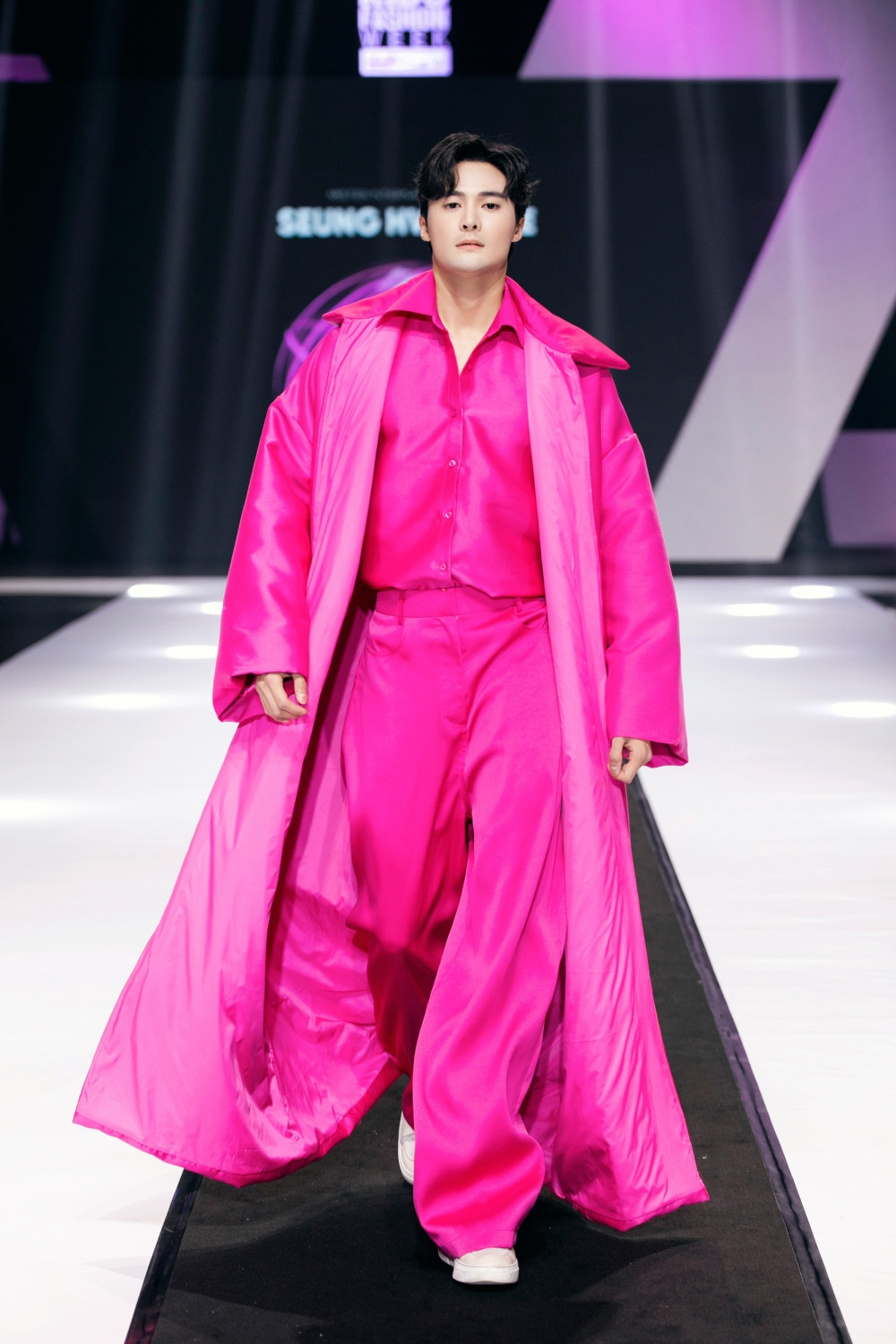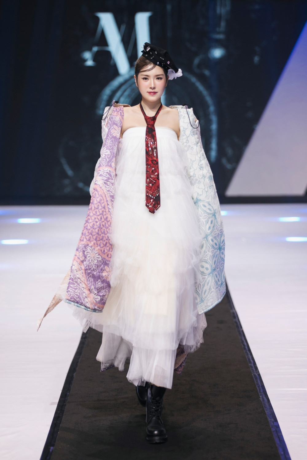 Hoa hậu Hoàn vũ Hàn Quốc 2023 được giao vị trí vedette cho BST của NTK Indonesia. Cô diện váy cúp ngực khoe vai trần, khoác hờ áo choàng.