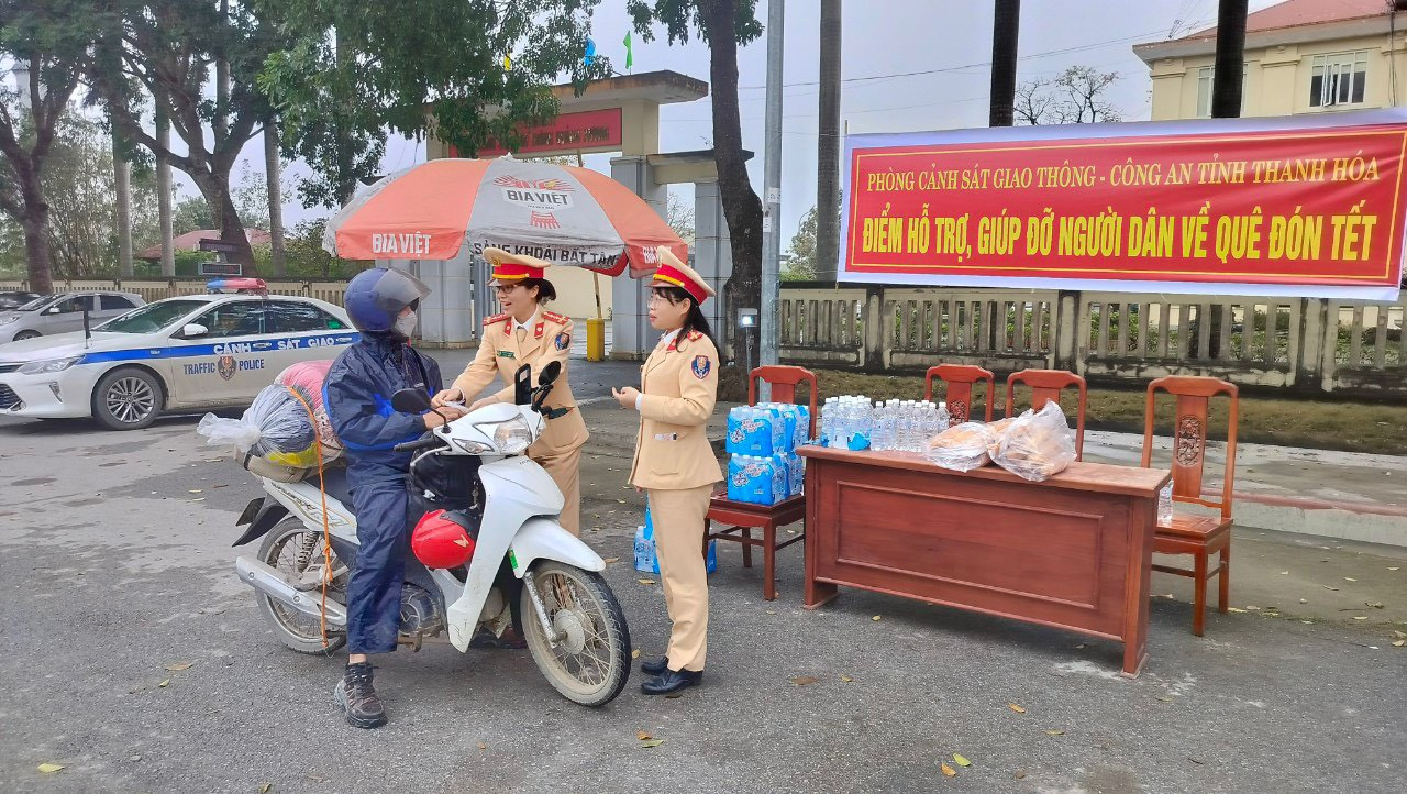 Cùng từ 28 Tết trên dọc các tuyến quốc lộ, tỉnh lộ qua địa bàn tỉnh Thanh Hóa, lực lượng CSGT Công an tỉnh Thanh Hoá đã lập nhiều điểm hỗ trợ nhu yếu phẩm (nước uống, đồ ăn nhẹ) và hướng dẫn, chỉ đường cho người dân đi xe máy về quê an toàn, thuận lợi. Người dân nào đi xe máy qua địa bàn tỉnh có nhu cầu khi ghé vào điểm dừng chân đều được lực lượng CSGT phát nước và lương thực để tiếp sức cho bà con tiếp tục hành trình về quê ăn Tết.