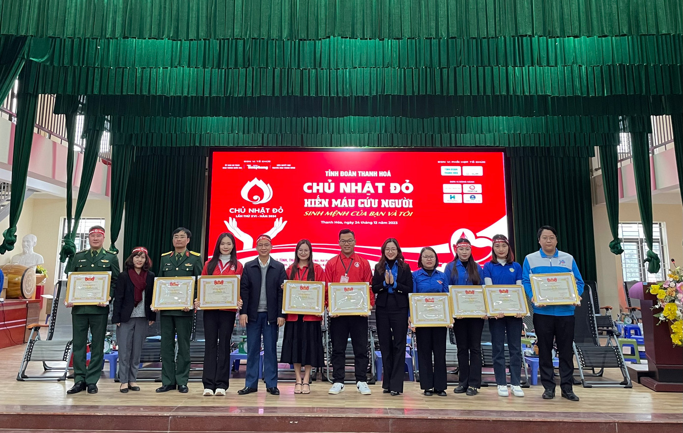 Các cơ sở Đoàn có tình nguyện viên đăng ký tham gia hưởng ứng, hiến máu tại chương trình Chủ Nhật Đỏ tại Thanh Hoá vào sáng 24/12, gồm: Trường Đại học Văn hóa, Thể thao và Du lịch: 150 sinh viên; Trường Đại học Hồng Đức: 300 sinh viên; Cao đẳng Y tế Thanh Hóa: 100 sinh viên; Đoàn khối các Cơ quan và Doanh nghiệp tỉnh: 100 người; Thành Đoàn TP. Thanh Hóa: 100 người; Đoàn TN Công an tỉnh: 100 người; Huyện đoàn Quảng Xương: 50 người; Đoàn thanh niên Ban Chỉ huy Bộ đội Biên phòng tỉnh Thanh Hóa: 50 người; Đoàn thanh niên Ban Chỉ huy Quân sự tỉnh Thanh Hóa: 50 người- Chị Lê Thị Trang - Trưởng Ban Đoàn kết tập hợp thanh niên (Tỉnh Đoàn Thanh Hóa) thông tin.