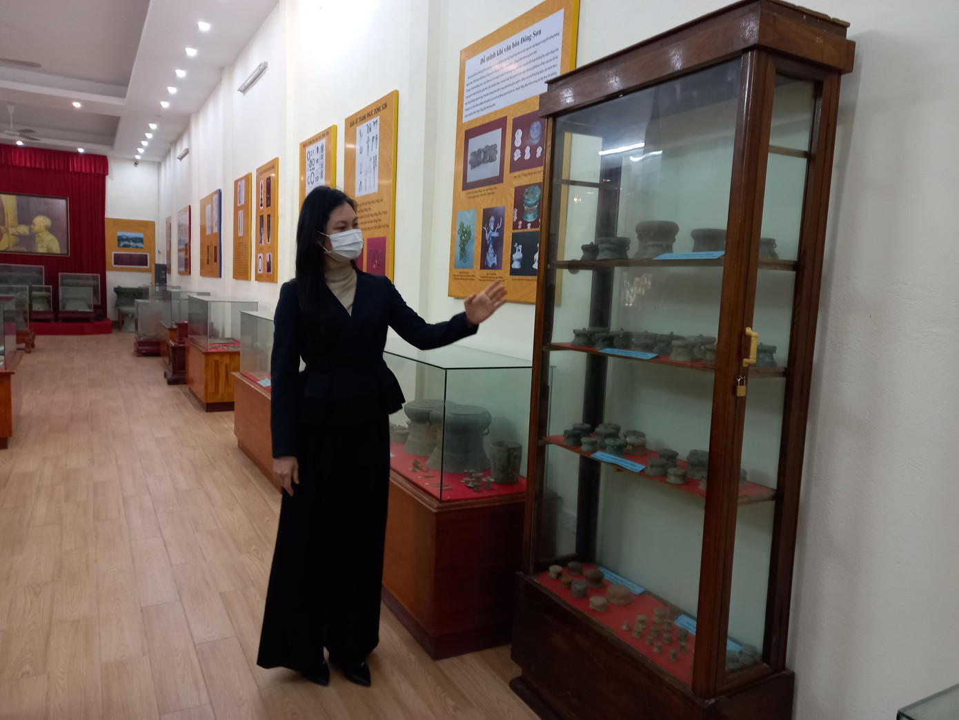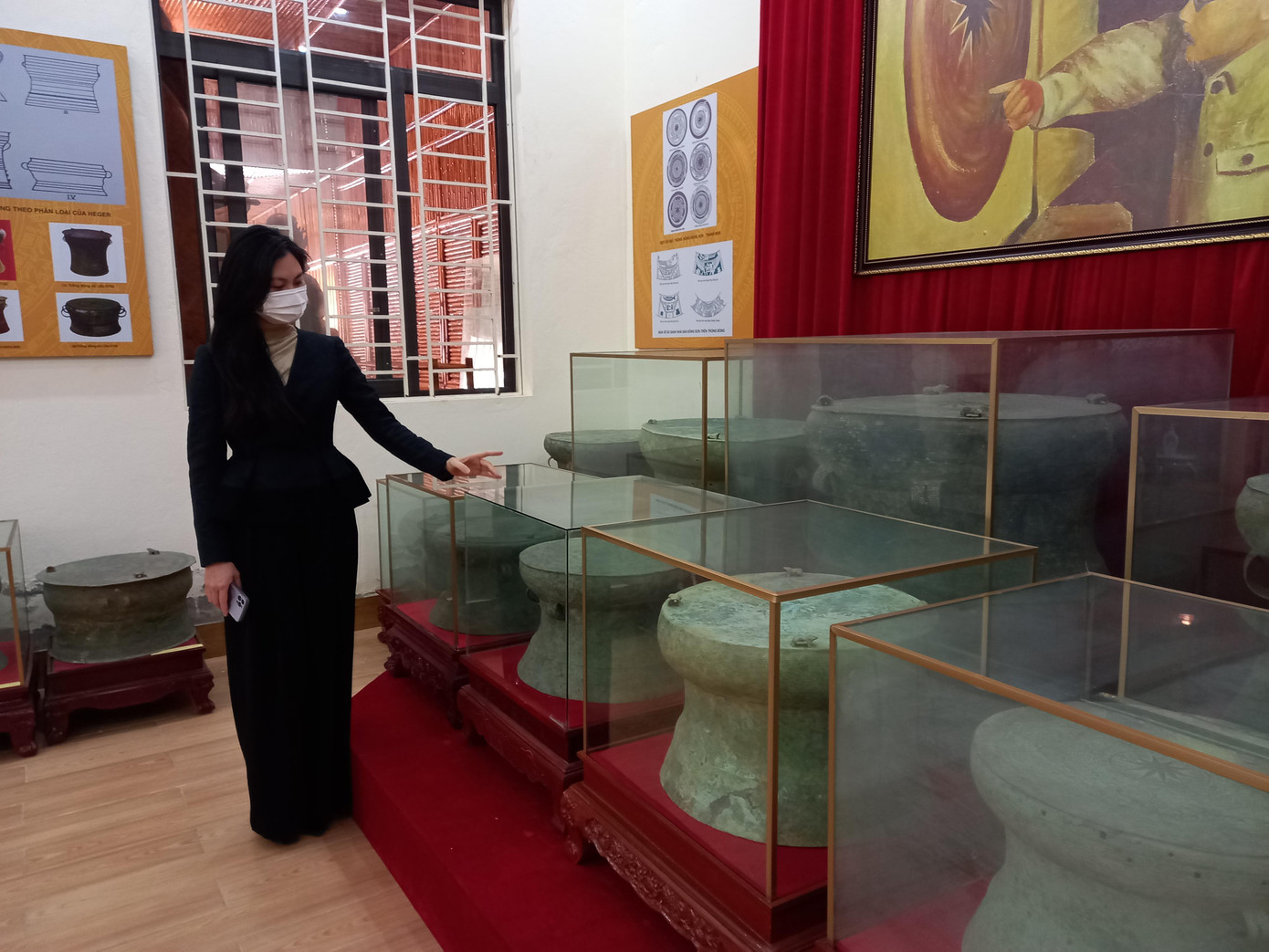 | Bà Nguyễn Thị Thanh Hiền (bên trái ảnh), Giám đốc Bảo tàng cổ vật Đông Sơn giới thiệu bộ sưu tập trống đồng tại bảo tàng |