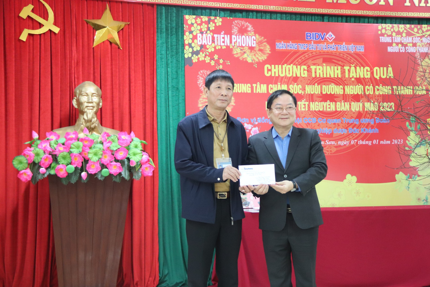 | Nhà báo Lê Xuân Sơn, Tổng Biên tập báo Tiền Phong trao 40 triệu đồng quà Tết của Doanh nghiệp dược Đức Khánh gửi tặng Trung tâm chăm sóc, nuôi dưỡng người có công tỉnh Thanh Hoá (20 triệu đồng) và Trung tâm bảo trợ xã hội số 2 tỉnh Thanh Hoá (20 triệu đồng). |