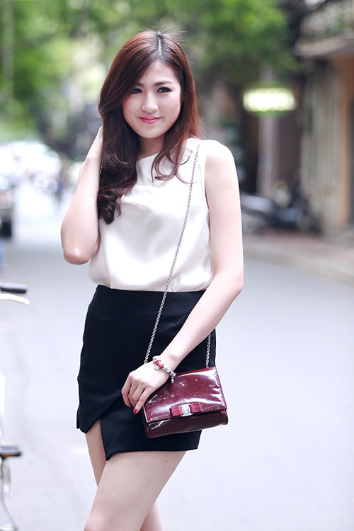 Á hậu Tú Anh trẻ trung khi mix sơ mi trắng và chân váy đen.