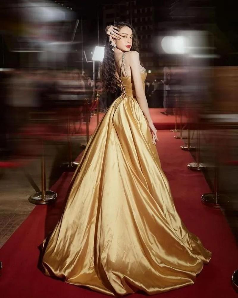 Trước đây, người đẹp từng thả dáng trên thảm đỏ của một sự kiện đình đám khác cùng chiếc đầm sa-tin to khổng lồ màu hoàng kim với đôi môi đỏ chói. Chưa hết, cô còn chọn cho mình kiểu tóc uốn phồng, xoăn xù, hoa tai ngọc trai to bản để nổi bật. Ở sự kiện này, khi đang tranh thủ "tạo nét", Lương Mỹ Kỳ đã gặp phải sự cố đạp trúng tà váy suýt ngã.