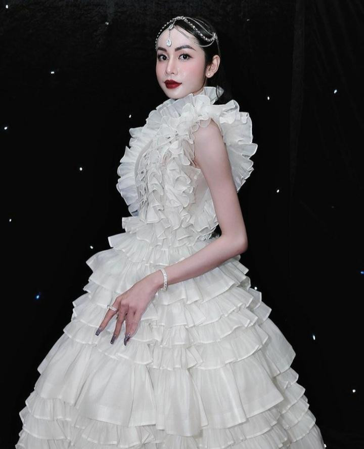 Khi tham dự thảm đỏ dự án phim của Lý Nhã Kỳ, Lương Mỹ Kỳ "chơi lớn" với một chiếc đầm trắng có thiết kế xếp tầng như công chúa kết hợp với phụ kiện tóc lấp lánh rủ xuống trán. Màu son môi đậm là lựa chọn ưa thích của Lương Mỹ Kỳ để luôn nổi bật.
